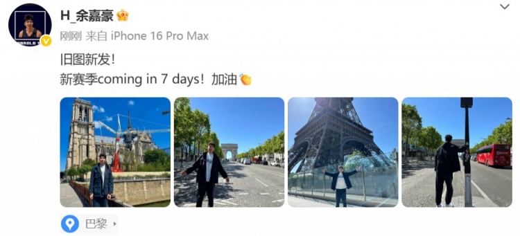 余嘉豪更新社媒,晒出了一组近照并配文写道:“旧图新发!新赛季coming in 7 days!加油”