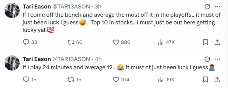 9月26日讯 今天,火箭前锋塔里-伊森上网和“球迷”互动。 伊森写道:“如果我场均上场24分钟,场均12分,那可能只是运气好吧♂️。如果我在季后赛中作为替补上场并且场均得分最高,那可能只是运气吧。在抢断和盖帽方面排名前十,我可能只是在这里碰运气罢了。”