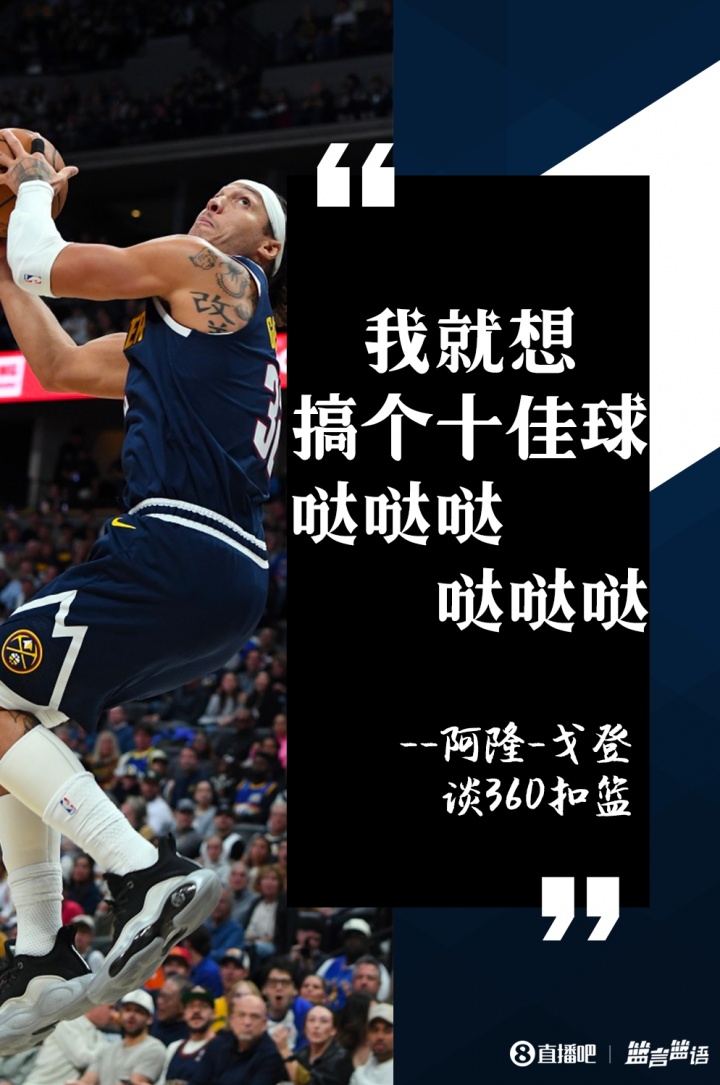 赛后,戈登接受了记者采访。谈到自己在比赛贡献360°扣篮,他说道:“我就是想搞个十佳球,ESPN,哒哒哒,哒哒哒。”