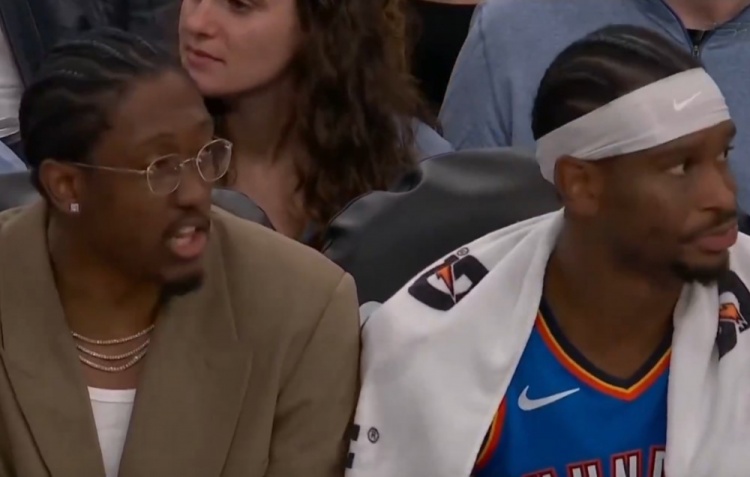 比赛最后时刻,镜头给到板凳席上的雷霆众将,亚历山大和仍在养伤的杰伦·威廉姆斯神同步。