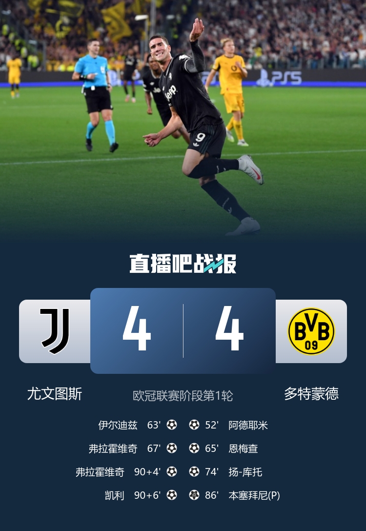 09月17日讯 欧冠联赛阶段首轮,尤文4-4奇迹绝平多特,双方下半场合计贡献8粒进球! 就在3天前意甲尤文主场对战国米的比赛中,尤文同样打出大比分,全场4-3逆转国米!