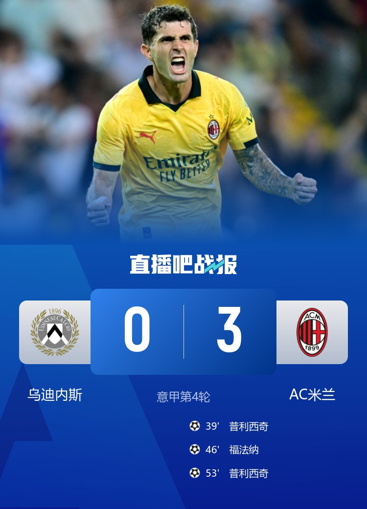普利西奇2射1传,乌迪内斯0-3米兰。积分榜方面乌迪内斯7分第五,米兰9分暂第三。 意甲积分榜:米兰三连胜后暂升第3!距目前榜首尤文1分 意甲3连胜遭终结!尤文1-1维罗纳 小孔塞桑贴地斩马里奥送点