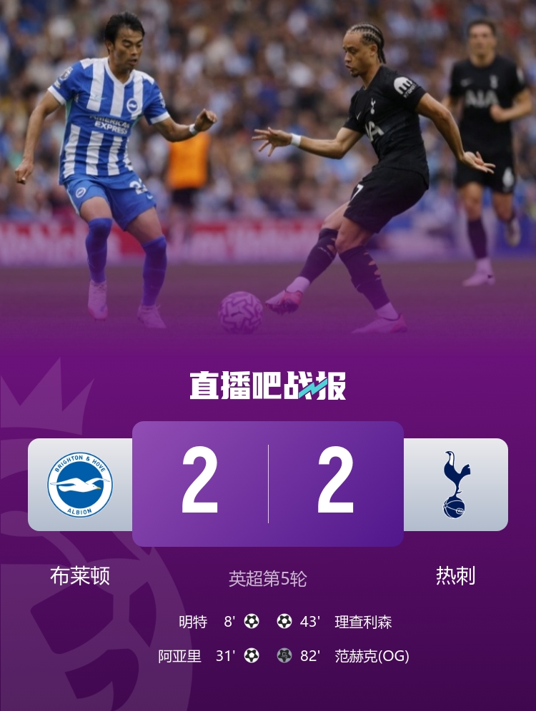 理查利森建功,布莱顿2-2热刺。本场过后,热刺3胜1平1负积10分暂升第2,布莱顿1胜2平2负积5分排名第12。 3连胜暂升第3!米兰3-0完胜乌迪内斯 普利西奇2射1传福法纳破门