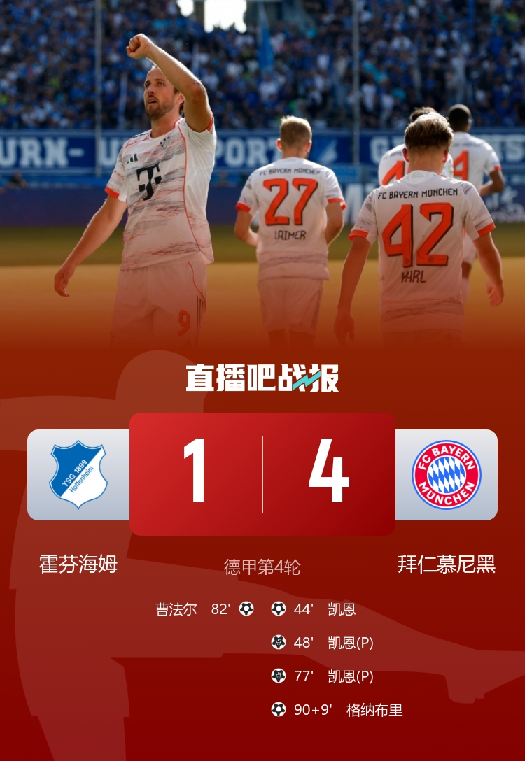 凯恩戴帽,拜仁4-1霍芬海姆,开赛四连胜继续领跑积分榜。 大英帝星恐怖如斯!凯恩新赛季7场轰13球3助,其中2次戴帽3次双响 英超-热刺让2追2战平布莱顿 理查利森破门范赫克乌龙阿亚里世界波