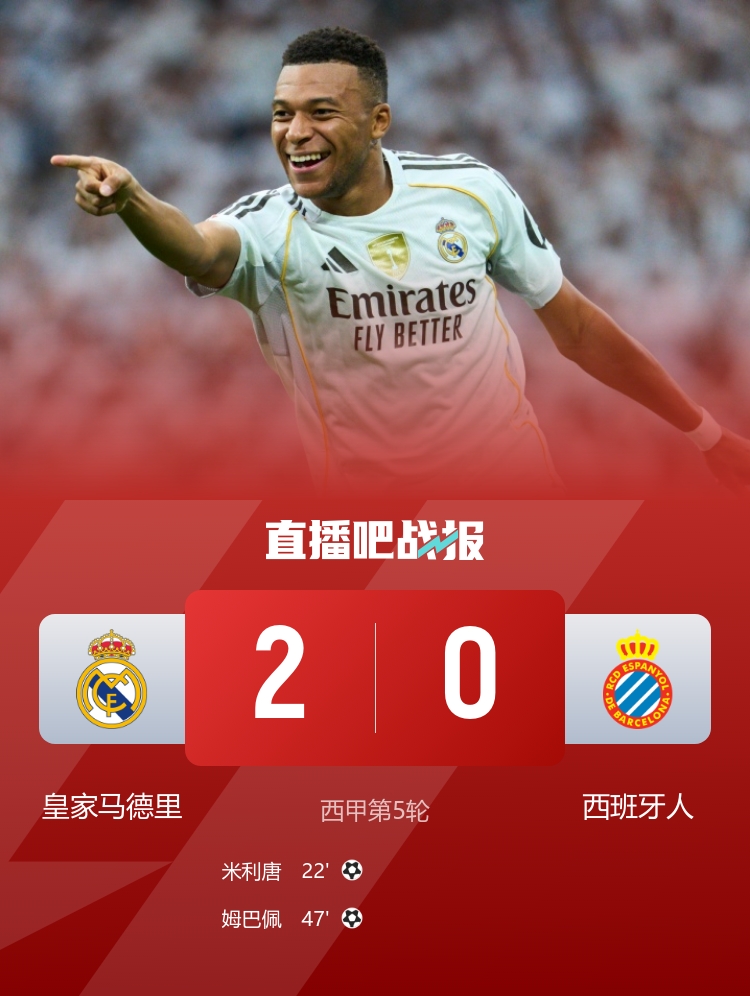 姆巴佩世界波破门,皇马2-0击败西班牙人,取得联赛5连胜,继续领跑西甲。 西甲积分榜:皇马开局5连胜登顶,先赛领先第二巴萨5分 开赛四连胜!拜仁4-1霍芬海姆继续领跑 凯恩戴帽奥利塞造点