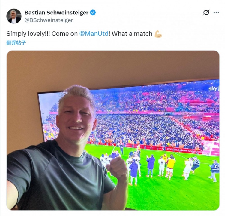 10月20日讯 英超第8轮比赛,曼联客场2-1击败利物浦。 曼联旧将、德国足坛名宿施魏因斯泰格通过电视观看双红会,赛后他晒出自己在电视机前的照片,配文:“简直太美妙了!加油曼联,多么精彩的比赛!” |